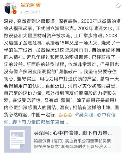 例如鴻星爾克總裁吳榮照7月25日發的一條微博動態,短短幾百字裏講述了創業路上遇到過的艱辛困難、回應了“瀕臨破產”的(de)傳(chuan)聞(wen),又(you)表(biao)明(ming)了(le)自(zi)己(ji)和(he)品(pin)牌(pai)的(de)初(chu)心(xin),在(zai)這(zhe)個(ge)熱(re)點(dian)上(shang)很(hen)好(hao)地(di)接(jie)住(zhu)了(le)這(zhe)波(bo)大(da)流(liu)量(liang),直(zhi)接(jie)把(ba)鴻(hong)星(xing)爾(er)克(ke)的(de)品(pin)牌(pai)形(xing)象(xiang)拉(la)高(gao)了(le)一(yi)大(da)個(ge)檔(dang)次(ci)。這(zhe)條(tiao)微(wei)博(bo)迅(xun)速(su)登(deng)上(shang)微(wei)博(bo)熱(re)搜(sou)、出圈,隨後又繼續登上B站和抖音熱搜榜,實現了相當高效的傳播。