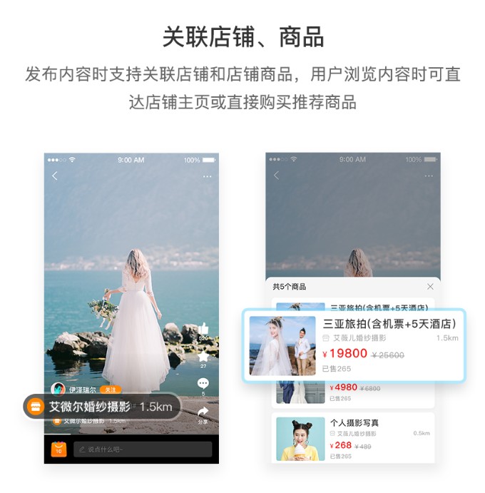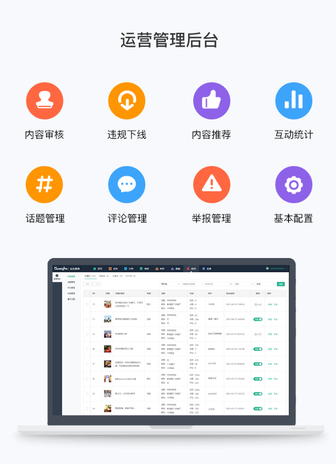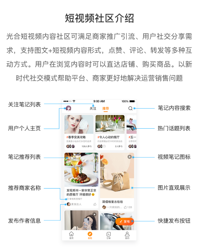應用簡介:光合短視頻內容社區可滿足商家推廣引流,用戶社交分享需求,支持圖文+短視頻內容形式。發布視頻支持關聯商家或者商品。
